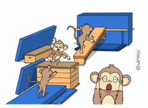 Beim Affengarten stellen die Kinder mit allen möglichen Geräten und Materialien aus dem Geräteraum Wege durch die Turnhalle auf. Dabei gilt: Der Boden darf nicht berührt werden. Anschließend gibt es zwei Fänger bzw. Fängerinnen, die sich ebenfalls nur auf den aufgebauten Wegen bewegen dürfen und versuchen, die „Affen“ einzufangen.