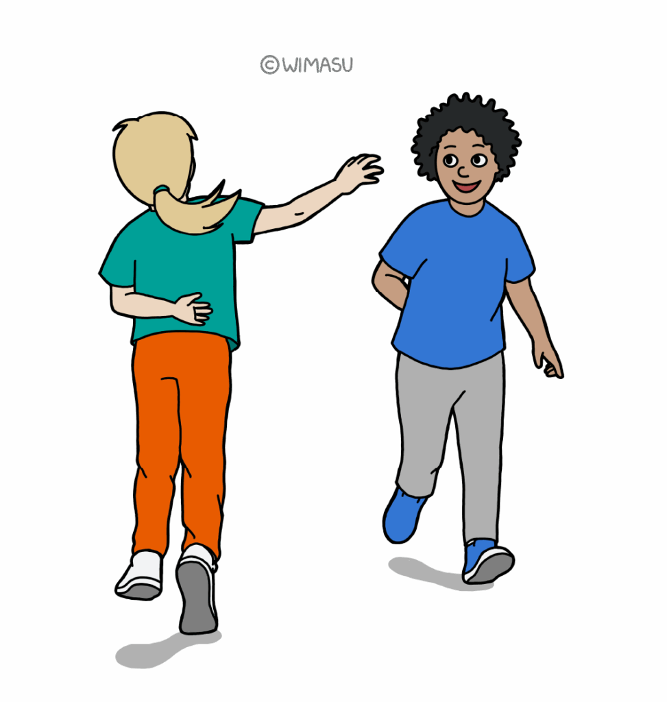 Alle Kinder legen eine Hand auf den Rücken – möglichst weit oben, damit niemand auf den Po schlägt. Dann laufen alle durcheinander und versuchen, anderen Kindern mit der freien Hand ein „High-Five“ auf die Hand am Rücken zu geben. Jeder Treffer wird gezählt. Nach ein bis zwei Minuten wird die Hand gewechselt und gemeinsam ausgewertet. Es entsteht viel Bewegung und es gibt keine Verlierer.