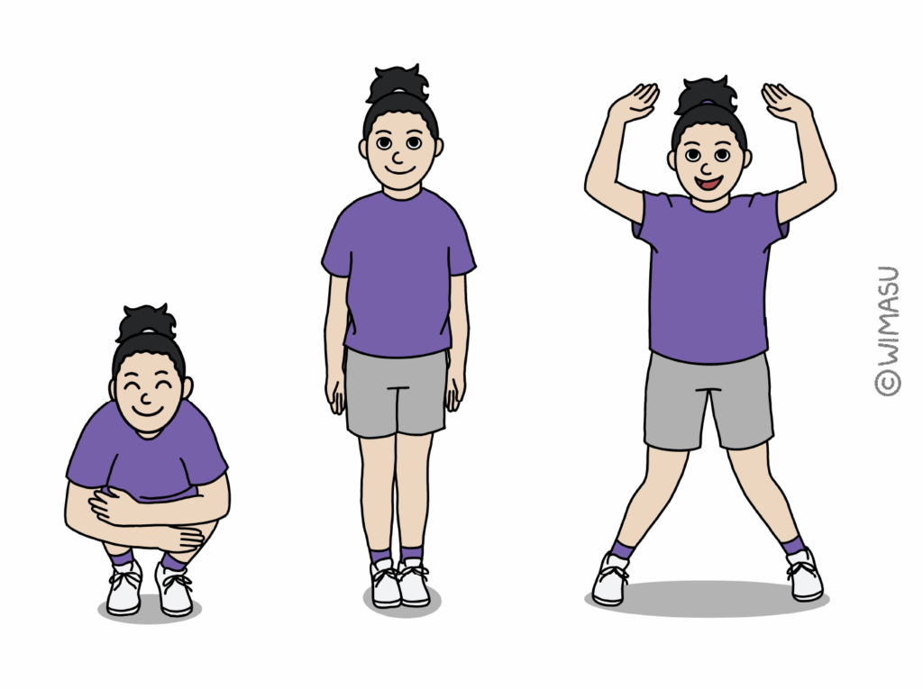 • Schere: Arme nach oben, Beine breit zu einem X