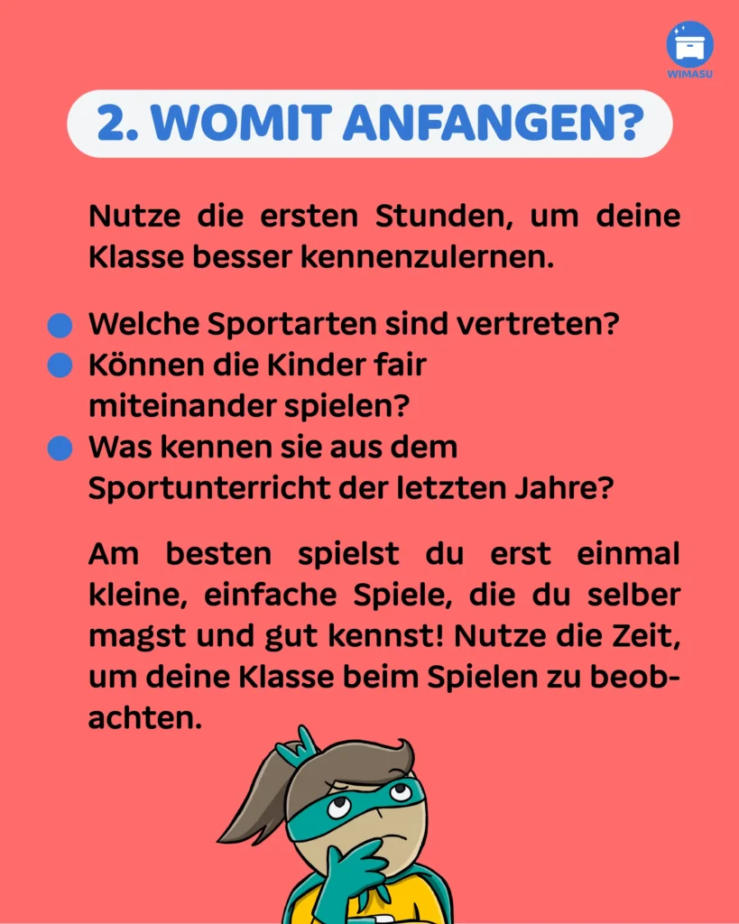 Nutze die ersten Stunden, um deine Klasse besser kennenzulernen. Welche Sportarten sind vertreten? Können die Kinder fair miteinander spielen? Was kennen sie aus dem Sportunterricht der letzten Jahre? Am besten spielst du Erst einmal kleine einfache Spiele, die du selber magst und gut kennst! Nutze die Zeit, um deine klasse beim Spielen zu beobachten.