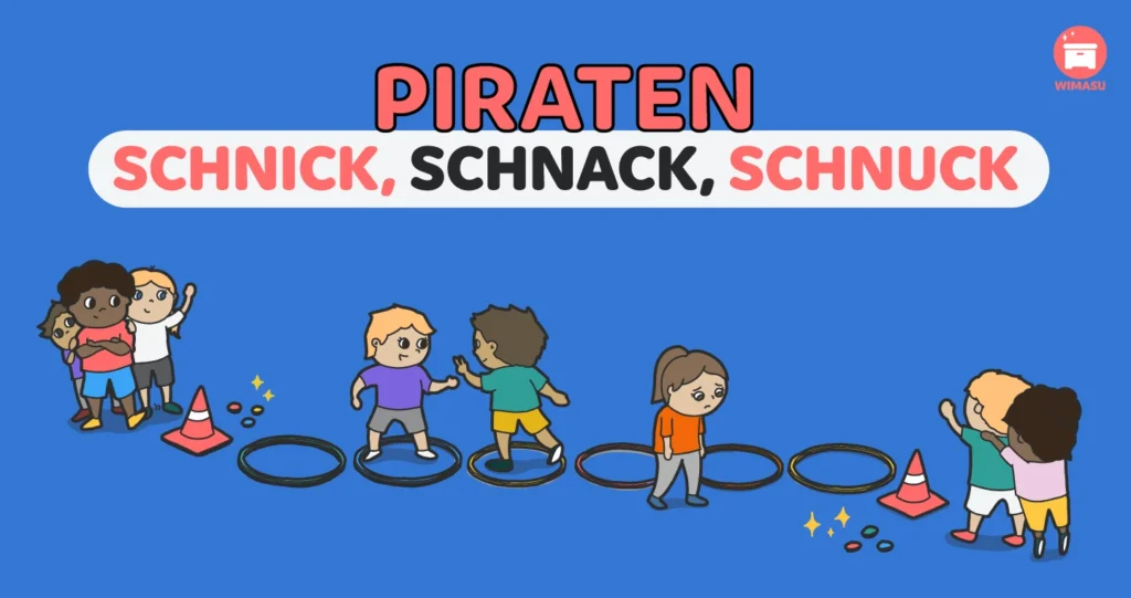 Auf ein Startsignal versucht jeweils das erste Mitglied der beiden Mannschaften auf die andere Seite zu hüpfen, um zum Schatz zu gelangen. Treffen die Beiden aufeinander kommt es zum Duell. In einer Runde Schnick Schnack Schnuck wird entschieden, wer weiterhüpfen darf. Wer verliert läuft außerhalb der Reifen zurück zum eigenen Team und stellt sich hinten an. In dem Moment, in dem das Duell entschieden ist, darf bereits das nächste Teammitglied der verlierenden Person starten. Schafft es ein Team bis zum Schatz, kann ein Stück mitgenommen und zu den eigenen Schätzen gebracht werden. Sobald ein Schatz aufgenommen wird, darf die nächste Person des Teams starten. Das Team gewinnt, welches den gesamten Schatz erobern kann. Um die Bewegungsintensität zu steigern empfiehlt es sich auf mehreren Spielfeldern mit 3-5 köpfigen Teams zu spielen.