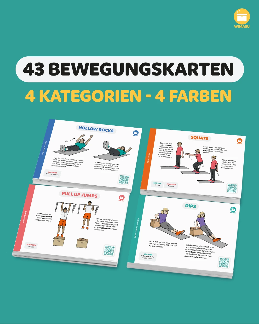 43 Fitnessübungen, farblich sortiert nach Körperregionen