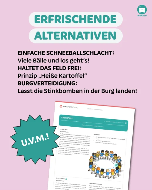 Entdecke eine erfrischende Alternative zu den traditionellen kleinen Ballspielen wie Gefängnisball, Brennball und Zweifelderball (Völkerball)! Unsere Sammlung von 18 kreativen und erprobten Spielen ist perfekt für den Sportunterricht in der Grundschule und Mittelstufe geeignet. In Zusammenarbeit mit “Trockenen Schneebällen” präsentieren wir dir die diese Spiele als PDF, die alle mit verschiedenen Softbällen (und natürlich auch trockenen Schneebällen) gespielt werden können. Lass dich von unserer Spielsammlung inspirieren und bring Abwechslung in deinen Unterricht! Viel Spaß beim Entdecken und Ausprobieren!