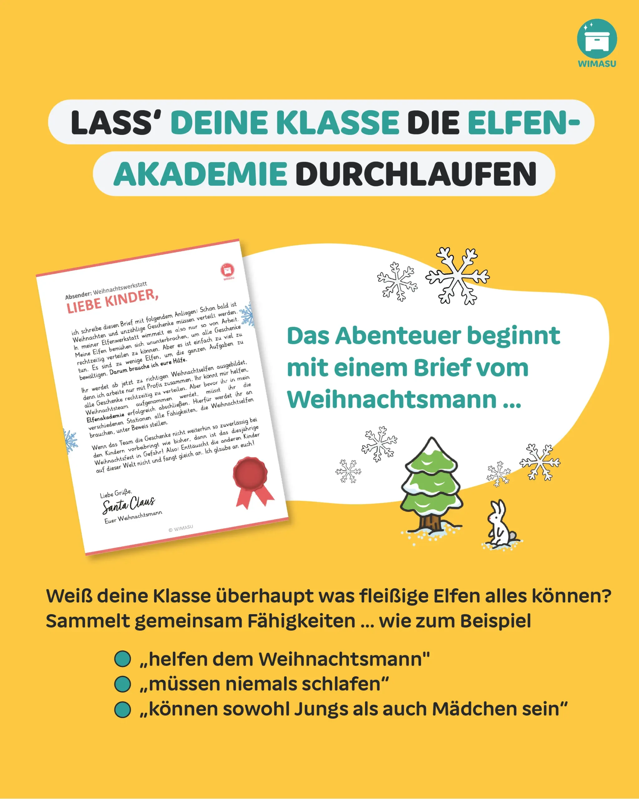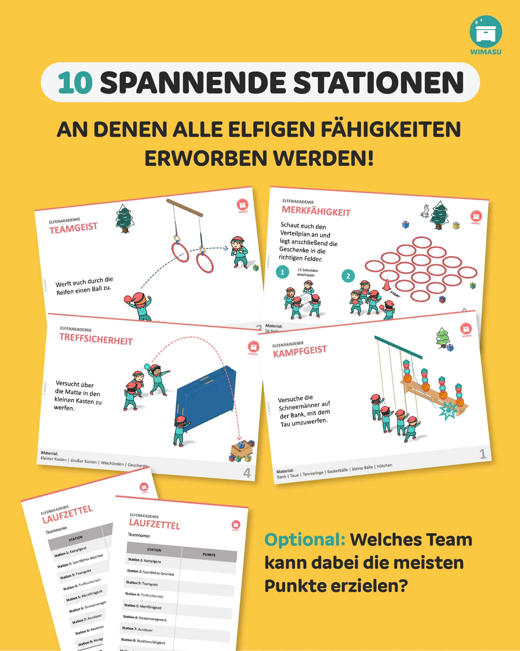 Gestalte deinen Sportunterricht in der Weihnachtszeit mit der Elfen-Akademie. 10 kreative Stationen warten auf deine Klasse. Wie liefern dir die Stationskarten für den direkten Einsatz im Sportunterricht der Grundschule oder das Kinderturnen im Vereinssport. Die Kinder können Punkte sammeln (oder man lässt es weg). Deine Klasse erhält zum Abschluss ein Elfen-Zeugnis und einen Brief vom Weihnachtsmann.