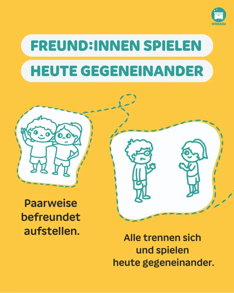 Paarweise befreundet aufstellen. Alle trennen sich und spielen heute gegeneinander.