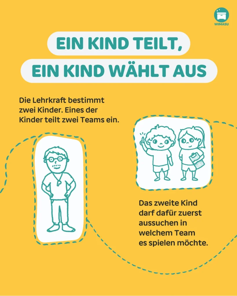 Die Lehrkraft bestimmt zwei Kinder. Eines der Kinder teilt zwei Teams ein. Das zweite Kind darf dafür zuerst aussuchen in welchem Team es spielen möchte.