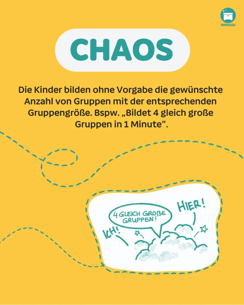 Die Kinder bilden ohne Vorgabe die gewünschte Anzahl von Gruppen mit der entsprechenden Gruppengröße. Bspw. „Bildet 4 gleich große Gruppen in 1 Minute”.
