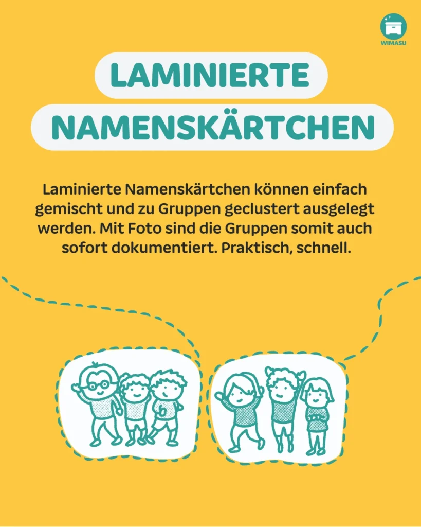 Laminierte Namenskärtchen können einfach gemischt und zu Gruppen geclustert auslegt werden. Mit Foto sind die Gruppen somit auch sofort dokumentiert. Praktisch, schnell.