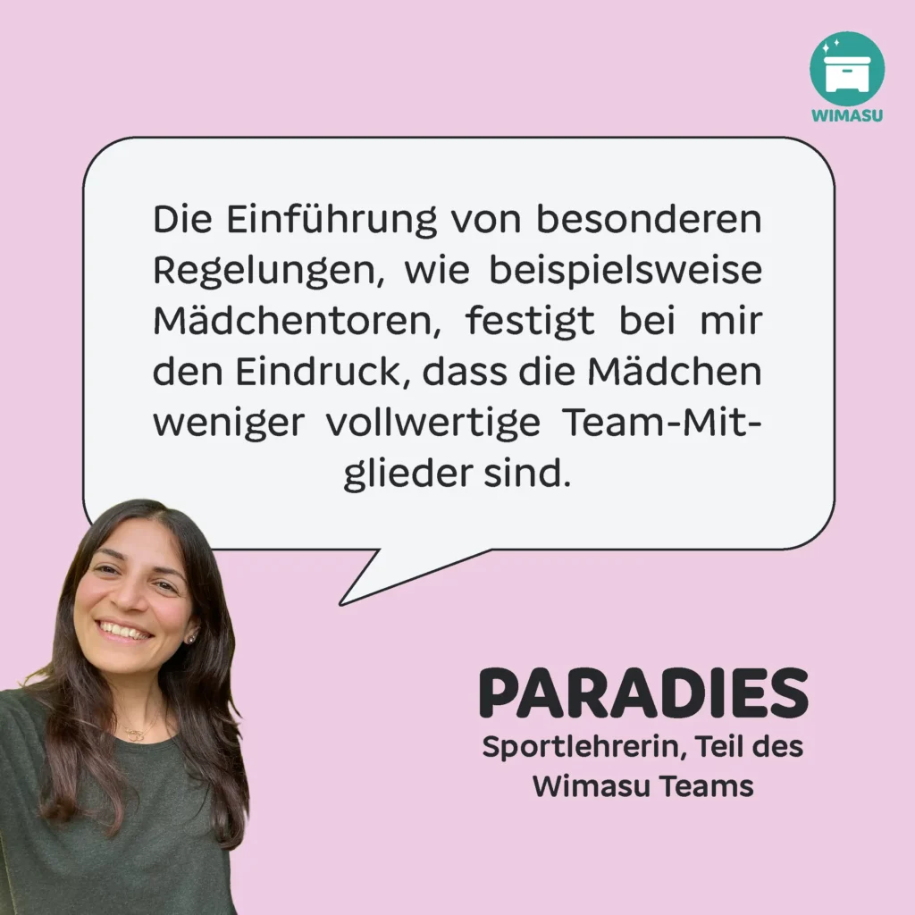 Aus Sicht einer Schülerin kann ich berichten, dass ich in meiner bisherigen Schullaufbahn von keinem Mädchen in meinem Umfeld mitbekommen habe, dass sie Sonderregeln bezogen auf das Geschlecht befürworten oder sich dadurch unterstützt fühlen. Geschlechterspezifische Regelungen können eine regelrechte Spaltung der Lerngruppe bedeuten. Ich erlebe es als kontraproduktiv, eine Regel aufzustellen, die beispielsweise besagt, dass bei Sportspielen mindestens ein Drittel eines Teams aus Mädchen bestehen muss. Das Problem, dass wir Mädchen in bestimmten Sportarten oder innerhalb des Unterrichts unterrepräsentiert sind oder systematisch ausgegrenzt werden, lässt sich meines Erachtens nicht dadurch lösen, dass man eine bestimmte Anzahl an weiblichen Personen festlegt, die miteinbezogen werden müssen.