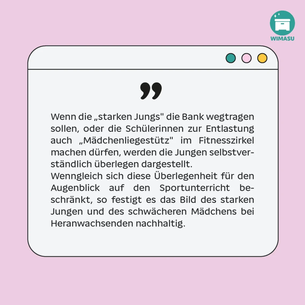 Wenn die „starken Jungs“ die Bank wegtragen sollen, oder die Schülerinnen zur Entlastung auch „Mädchenliegestütz“ im Fitnesszirkel machen dürfen, werden die Jungen selbstverständlich überlegen dargestellt. Wenngleich sich diese Überlegenheit für den Augenblick auf den Sportunterricht beschränkt, so festigt es das Bild des starken Jungen und des schwächeren Mädchens bei Heranwachsenden nachhaltig. Dies bedeutet nicht, dass Differenzen grundsätzlich gänzlich außer Acht gelassen werden können. Differenzierungen sind unabhängig vom Schulfach unabdinglich für den modernen Unterricht. Jedoch sollte bei der Planung und Umsetzung des Sportunterrichts stets hinterfragt und reflektiert werden, welche Funktion und welchen Hall gewisse Maßnahmen haben.