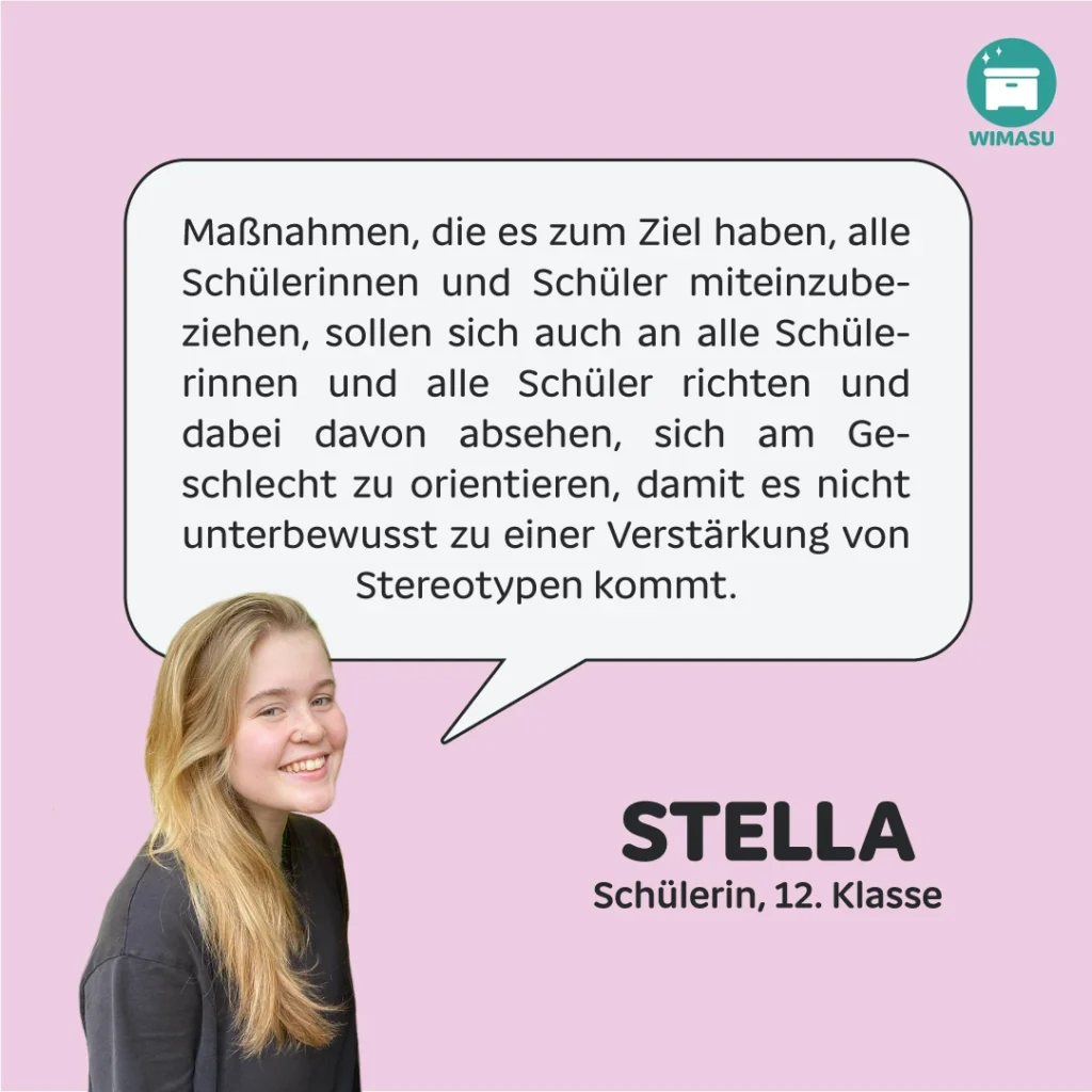 Stella: Als Schülerin wünsche ich mir, dass eine Lernumgebung geschaffen wird, in der Schüler:innen unabhängig vom Geschlecht nach Leistungsfähigkeit und persönlicher Entwicklung beurteilt werden. Maßnahmen, die es zum Ziel haben, alle Schülerinnen und Schüler miteinzubeziehen, sollen sich auch an alle Schülerinnen und alle Schülerrichten und dabei davon absehen, sich am Geschlecht zu orientieren, damit es nicht unterbewusst zu einer Verstärkung von Stereotypen kommt.